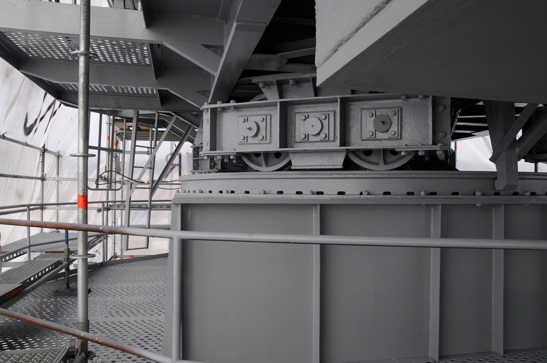 Fackverkskonstruktioner och boogie högtryckstvättades med hetvatten och målades med alkydfärg. Rostskador på emaljerade skyltar och armaturer rostskyddsbehandlades och friställ retuscherades med linoljefärg. Brister på elsystem, mekanik åtgärdades, enligt tidigare framtagna prioriteringar i syfte att behålla så mycket originalkomponenter som möjligt